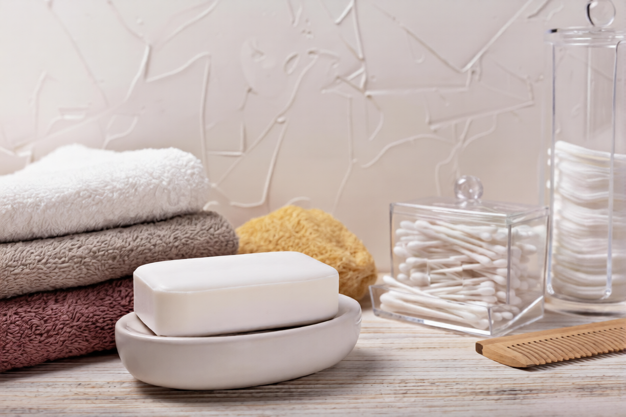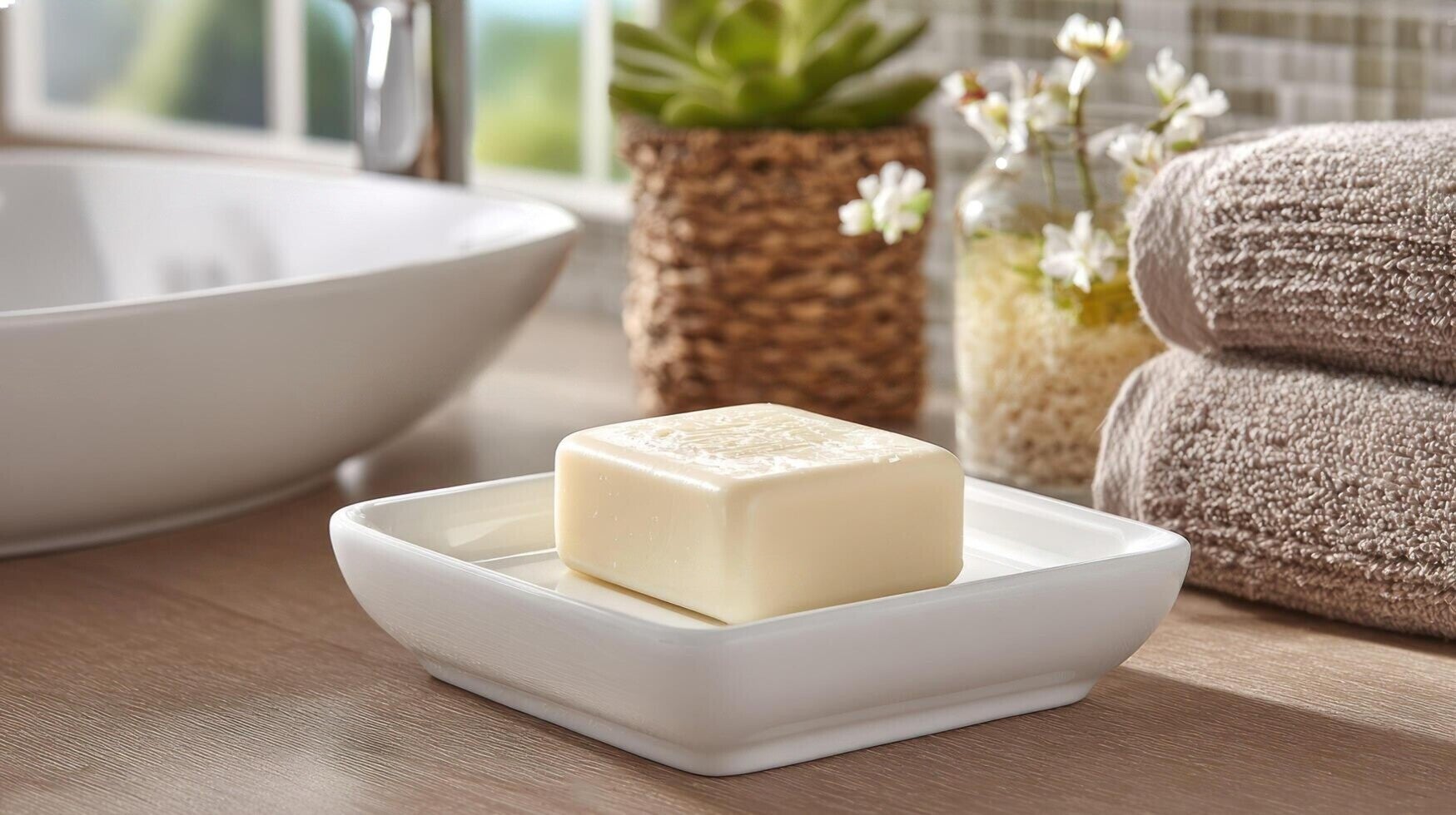 A simple bar of soap sits in its dish, surrounded by folded towels—an everyday essential rarely granted airtime during the spectacle of NFL broadcasts.